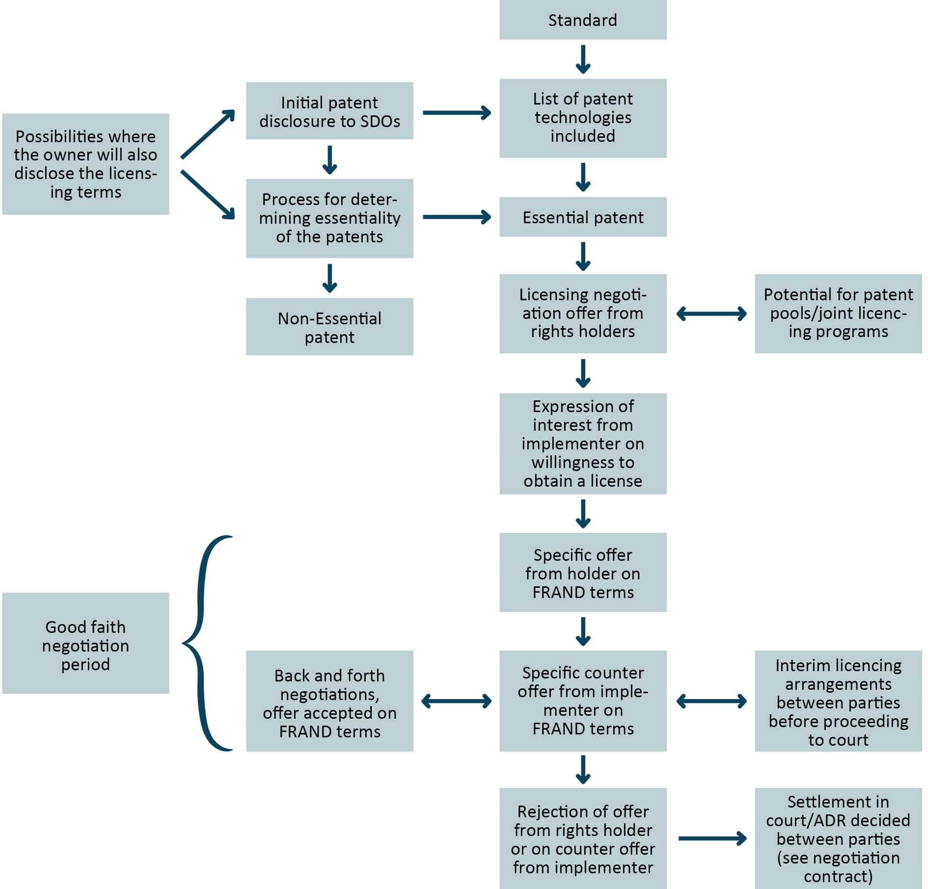 For essential patents, the rights holder initiates licensing negotiations by making an offer to implementers. Interested implementers respond with an expression of willingness to obtain a licence, triggering the core negotiation phase. This includes a good-faith exchange of offers and counter-offers based on Fair, Reasonable, and Non-Discriminatory (FRAND) terms. If an agreement is reached, licensing proceeds. If not, the parties may agree to interim arrangements or, ultimately, pursue settlement through court proceedings or alternative dispute resolution.