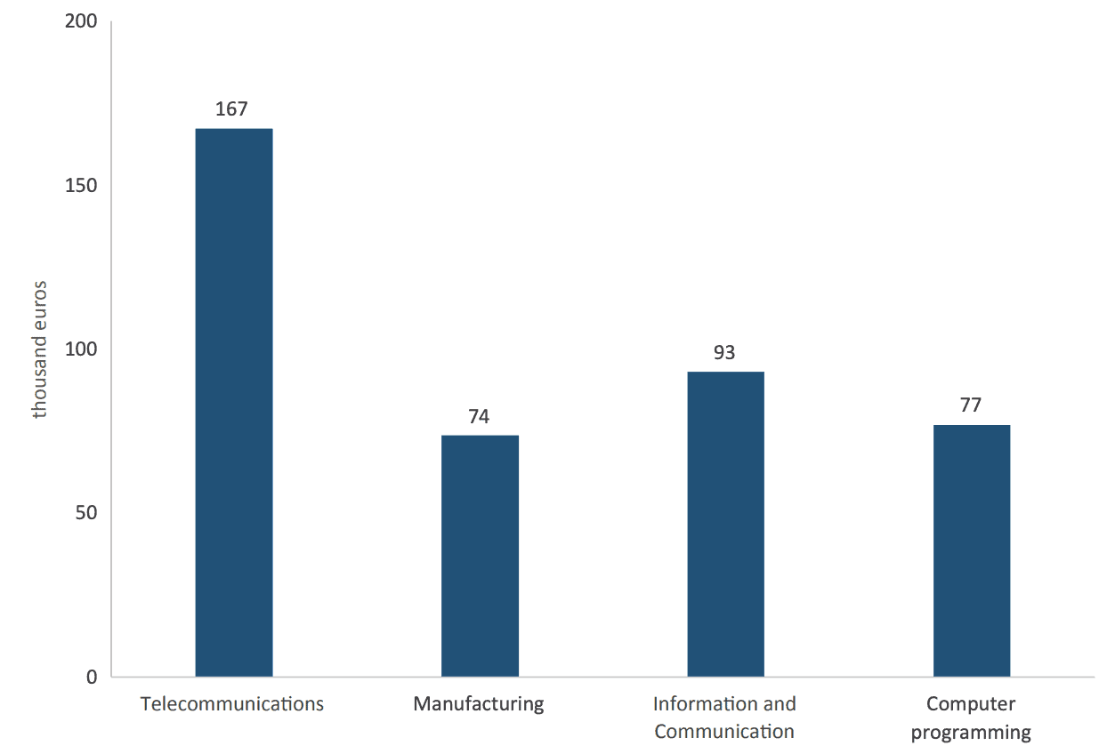 Figure 1: Labour productivity in the EU manufacturing, information and communication, telecommunication and computer programming sector (2021)Source: Eurostat, Apparent labour productivity – thousand euro. Sectors and NACE codes: Manufacturing (C); Information and Communication (J); Telecommunications (J61); Computer programming, consultancy and related activities (J62). Author’s calculations.