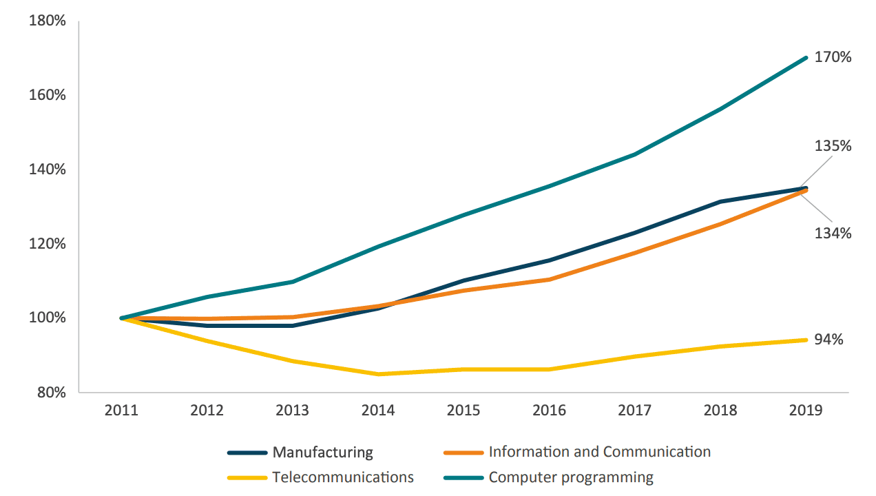 Figure 2: Change in value-added in the EU manufacturing, information and communication, telecommunication and computer programming sector (2011 = 100)Source: Eurostat. Author’s calculations.