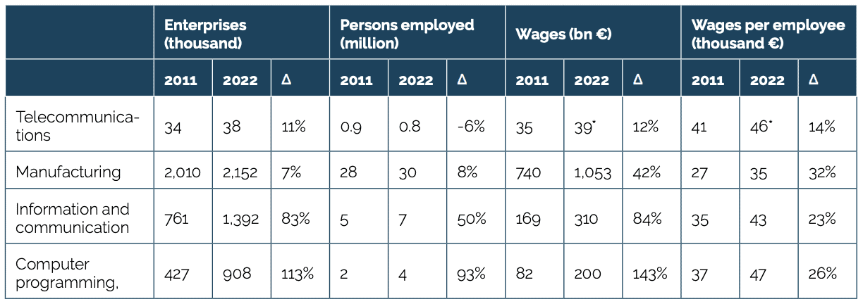 Table 1: Number of enterprises, persons employed, and wages in the EU manufacturing, information and communication, telecommunication and computer programming sector (2011-2022) Note: *Wages and Salaries – million euros for Telecomm 2021; Wages and Salaries / Person employed – number for Telecomm 2021. Source: Eurostat. Author’s calculations.