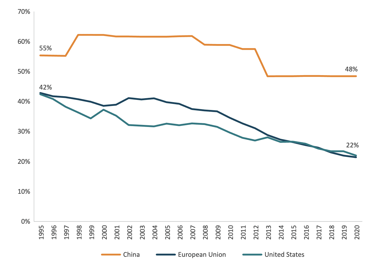 Figure 5: Telecommunication sector share of value-added over ICT for the EU, China and the US between 1995 and 2020.Source: OECD. Author’s calculations.
