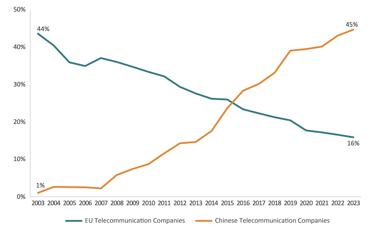 In summary, the performance of the EU telecommunications sector reveals a mixed picture. The overall sector has struggled to keep pace with other technology sectors, and in some areas, such as employment, it has even contracted over time. This erosion in the domestic market affects the wider ecosystem, including firms at the forefront of telecommunication technology development, which are increasingly reliant on foreign demand to grow.[7] Yet, Europe still hosts companies that are among the global leaders in the field. However, their position is no longer unchallenged: Chinese players are rapidly catching up. At the same time, the convergence between telecommunications and digital technologies creates a window of opportunity for EU telecommunication technology companies. But doing so will require confronting not just rising Asian competitors, but also US-based digital companies with deep R&D budgets.