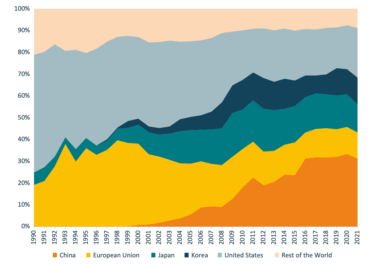 Figure 7: Share of patents in telecommunication in the EU, US, Korea, Japan, China, and the Rest of the World, 1990-2021Source: OECD-REGPAT. Author’s calculations.