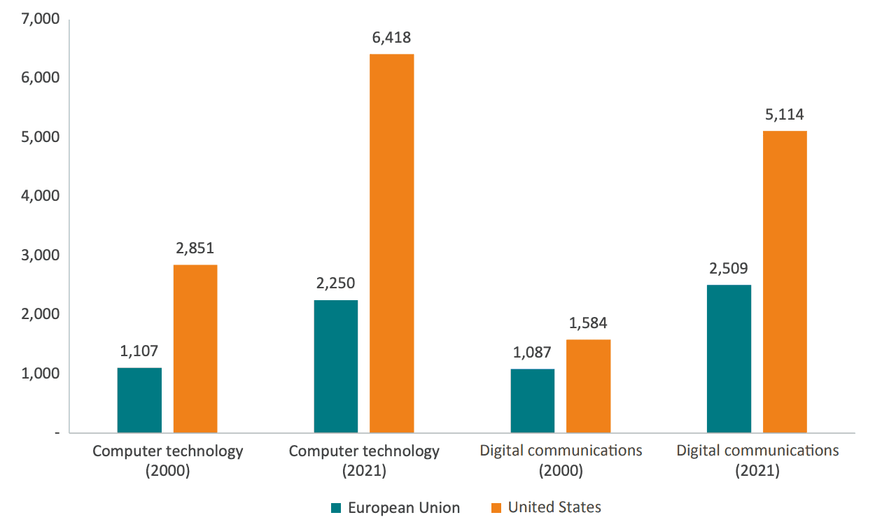 Figure 8: Total number of patent applications in computer technology and digital communication in the EU and the US (2000-2021) Source: OECD-REGPAT and Di Girolamo et al., 2023. Author’s calculations.