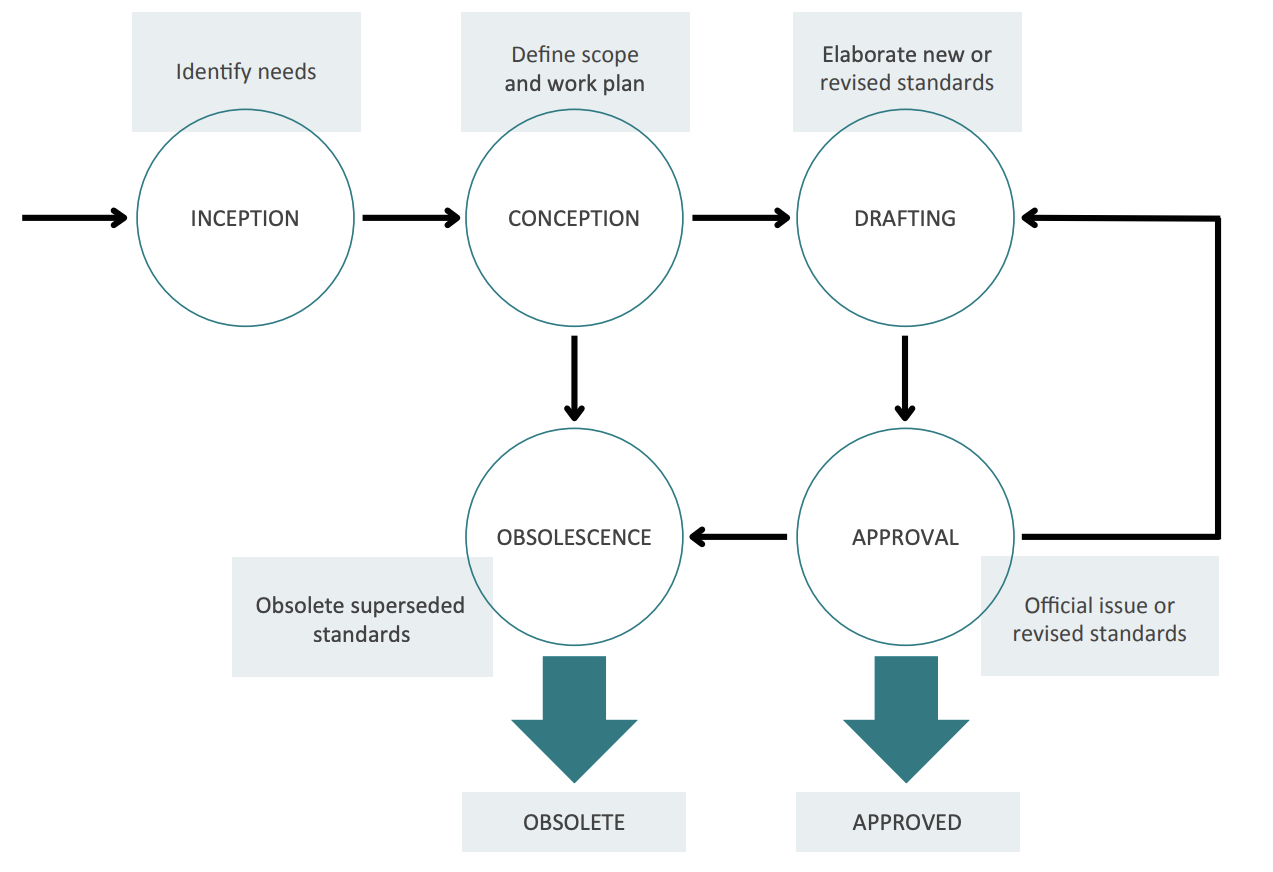 The development of a standard typically unfolds through several structured stages, as described in Figure 9.[1] The inception phase starts with identifying the need for a new standard and submitting a proposal to the SDO. Once a proposal is accepted, the SDO begins the conception phase, where it establishes internal teams and procedures to manage the lifecycle of the standard.