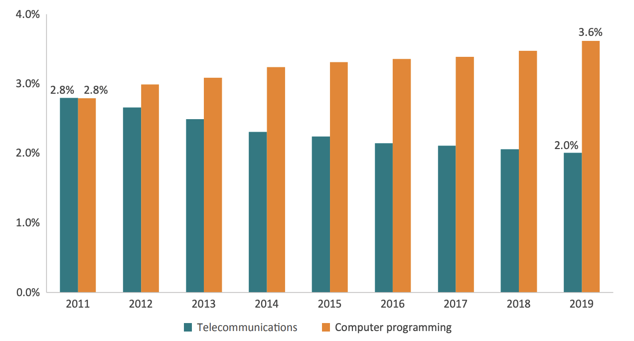 The decline in value-added means that Europe’s telecommunications sector has become less relevant within the broader business economy. The next figure illustrates value-added as a percentage of the private economy for telecommunications and computer programming between 2011 and 2019. In line with the findings presented in Figure 2, the telecommunication sector has steadily lost ground, while computer services has grown in importance.
