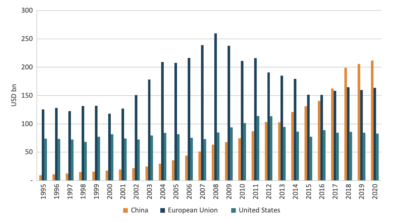 Figure 4: Value-added in the telecommunications sector for EU, China and the US between 1995 and 2020. Source: OECD. Author’s calculations.