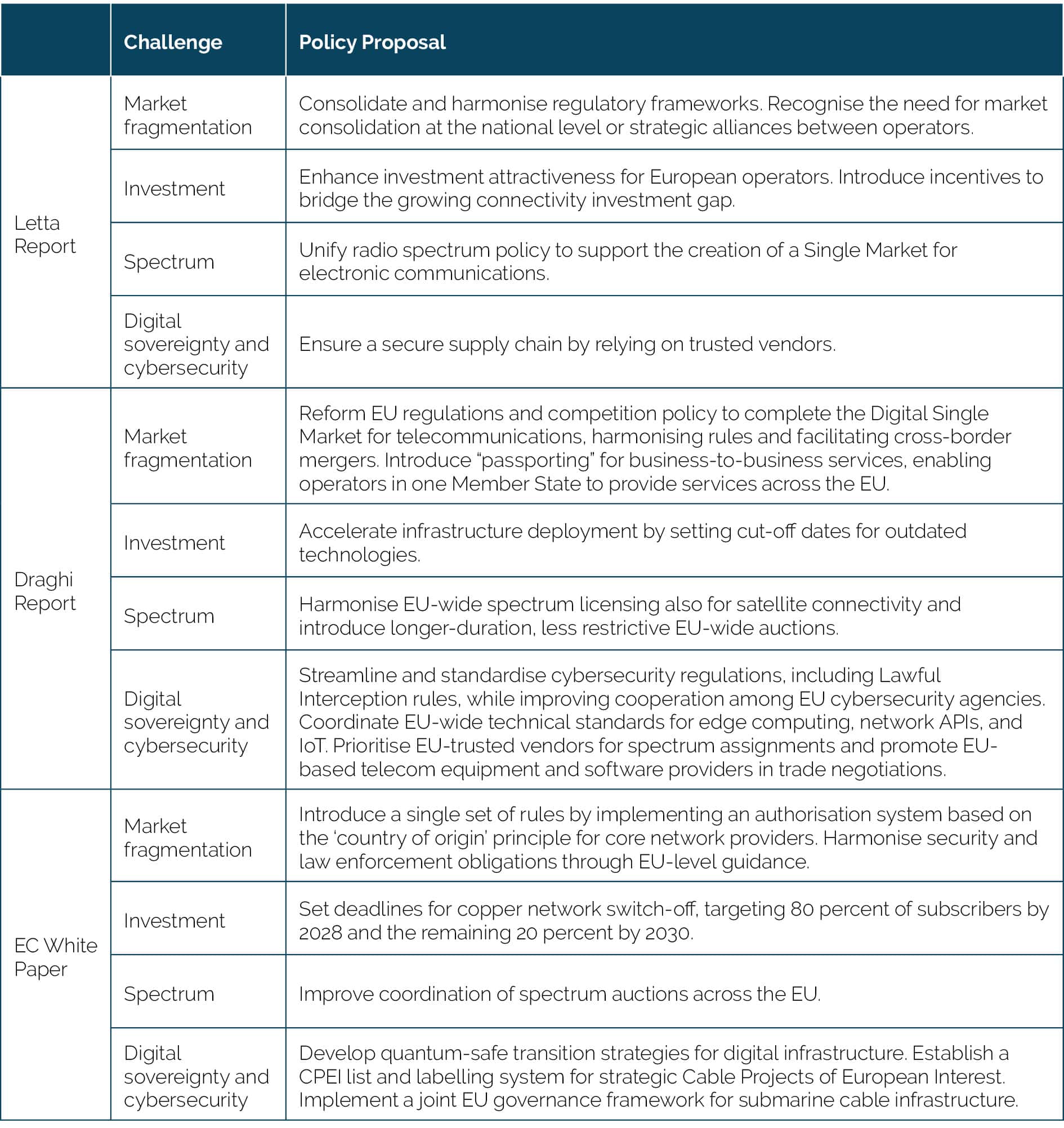 Table 1: Challenges and policy proposals for the EU telecommunication sector in the Letta Report, the Draghi Report and the European Commission White PaperAuthors from Letta, Draghi and European Commission white paper.
