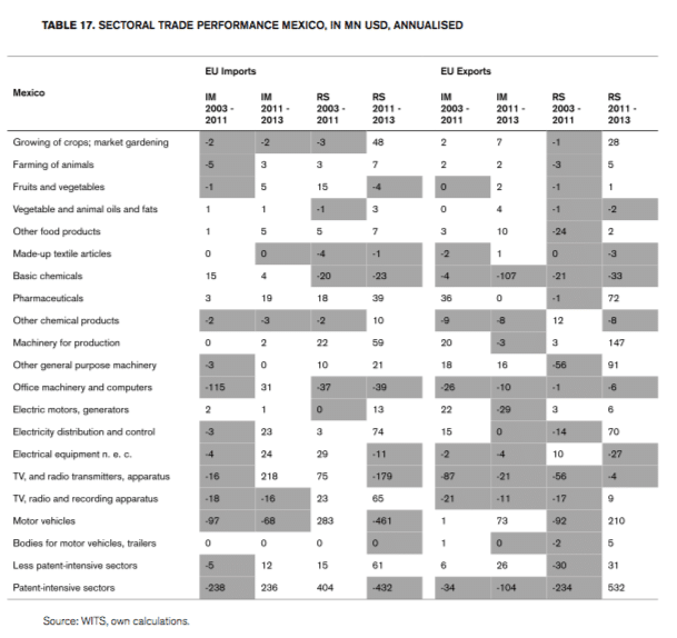 Mexico shows a similar pattern in aggregate numbers, with positive trends for pharmaceuticals, machinery and motor vehicles.