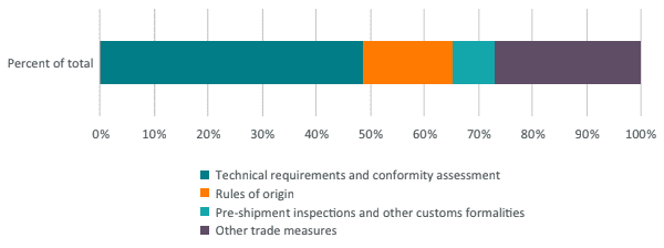 While processing trade arrangements are usually promoted as tariff-saving solutions, the biggest costs in today’s trade are non-tariff measures (NTMs). Econometric evidence and business surveys confirm that the costs of non-tariff measures are typically higher than tariffs. Among non-tariff measures, the most cumbersome and costly barriers are the technical barriers to trade (see Figure 5), i.e., the unnecessary costs of testing and certification across multiple markets and against different standards and technical requirements.
