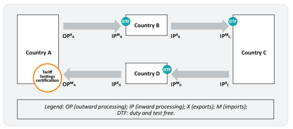 However, if the car parts face tariffs in country B, there are additional benefits to be made if the car engine would be imported in country B under its inward processing trade regime. Under the inward processing regime in country B there would be even more trade cost savings to be made, by waiving the need for unnecessary testing and certification of those EU car parts in country B. However, there are no rules to facilitate the inter-operability of one country’s outward processing regime with another country’s inward processing schemes.