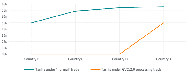 With these simple numerical assumptions and the schematic representation of a four-country “GVC 2.0” processing trade arrangements, the trade facilitation effects appear quite considerable. First, the intermediate products save the 5% tariff that would be charged under “normal trade” each time the product crosses the border. Under the “GVC 2.0” processing trade framework, there are no tariffs at the intermediate stages of production. There is a final 5% tariff to be paid on the value added that does not originate in country A. As can be seen from Figure 7, in “normal” trade the tariffs would accumulate over the supply chain as products would pay “tariffs on top of tariffs”, reaching cumulative levels that are higher than the nominal 5% tariff.