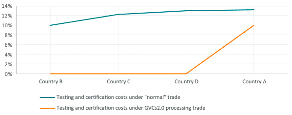 In addition to the tariff savings, under the “GVC 2.0” processing trade scheme, the intermediate products save also the unnecessary 10% testing and certification costs each time the product crosses borders, compared to a “normal” trade scenario. There is, of course, a testing and certification cost before the final product is placed on the market at the final importation stage in country A where the product will need to be tested and certified as compliant with the prevailing technical norms and regulations in the market (see Figure 8).