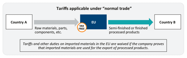 In the case of the EU, for instance, inward processing means that non-EU goods can be imported in order to be used by EU-based manufacturing companies in one or more processing operations, prior to their use in exported products. When imported, such goods are not subject to import duties and other taxes related to their import (such as VAT or excises). Moreover, goods imported under the inward processing procedure are not subject to other EU trade policy measures, including a number of otherwise costly trade formalities.