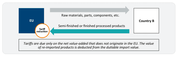 The outward processing scheme typically involves a company in the EU that outsources parts of the downstream activity to another country B. If we take the example of automotive supply chains, a complex production process involving many suppliers worldwide, the EU company exports several car parts (e.g. gearbox, electronic components) to a car assembly factory in country B. If the finished car containing the EU car parts is then re-imported into the EU, it will only pay tariffs on the value of the car minus the value of the components originally exported from (and now re-imported into) the EU.