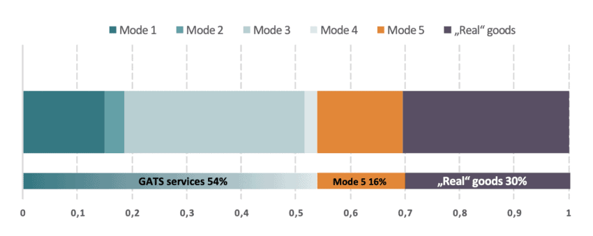 In reality, when all GATS modes of supply are taken into account, EU services trade accounts for 54% of total EU exports, which makes EU services trade bigger than goods trade. This is often ignored, even among trade policy experts, due to the way in which services trade statistics are compiled[9]. Now, add mode 5 services to it and “real” goods exports represent only about 30% of EU total exports (Figure 3).