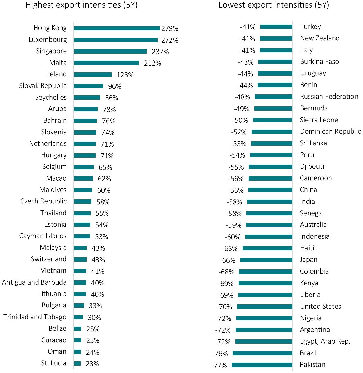 Figure 1: Top-30 “Inclusive Framework” countries with the highest and lowest export intensities