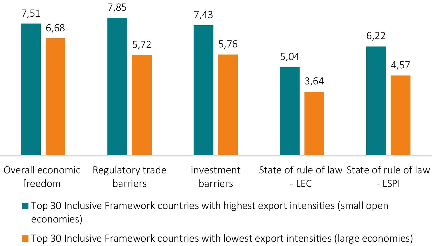 Empirical data also shows that the Inclusive Framework’s most export-intensive countries show on average a substantially higher degree of economic freedoms. Half of the Inclusive Framework’s most export-intensive countries rank higher than position 40 of 162 countries studied by the Fraser Institute. By contrast, half of the least export-intensive (large) countries rank worse than position 100 of 162 countries. In addition, the Inclusive Framework’s most export-intensive economies are generally much less restrictive to international trade than the least export-intensive countries. As concerns the state of the rule of law, numbers presented for the stringency of the enforcement of contracts and the state of the general legal system and property rights demonstrate that the IF’s most export-intensive economies generally perform better than the 30 least export-intensive countries. This result can be attributed to the high number of large countries among the 30 least export-intensive countries that perform poorly with respect to the state of the rule of law, e.g. Turkey, Italy, India, Indonesia, Egypt, Argentina, Brazil and Nigeria (see Figure 4 and, for a detailed overview Table 7, 8, 9 and 10 in Appendix II).