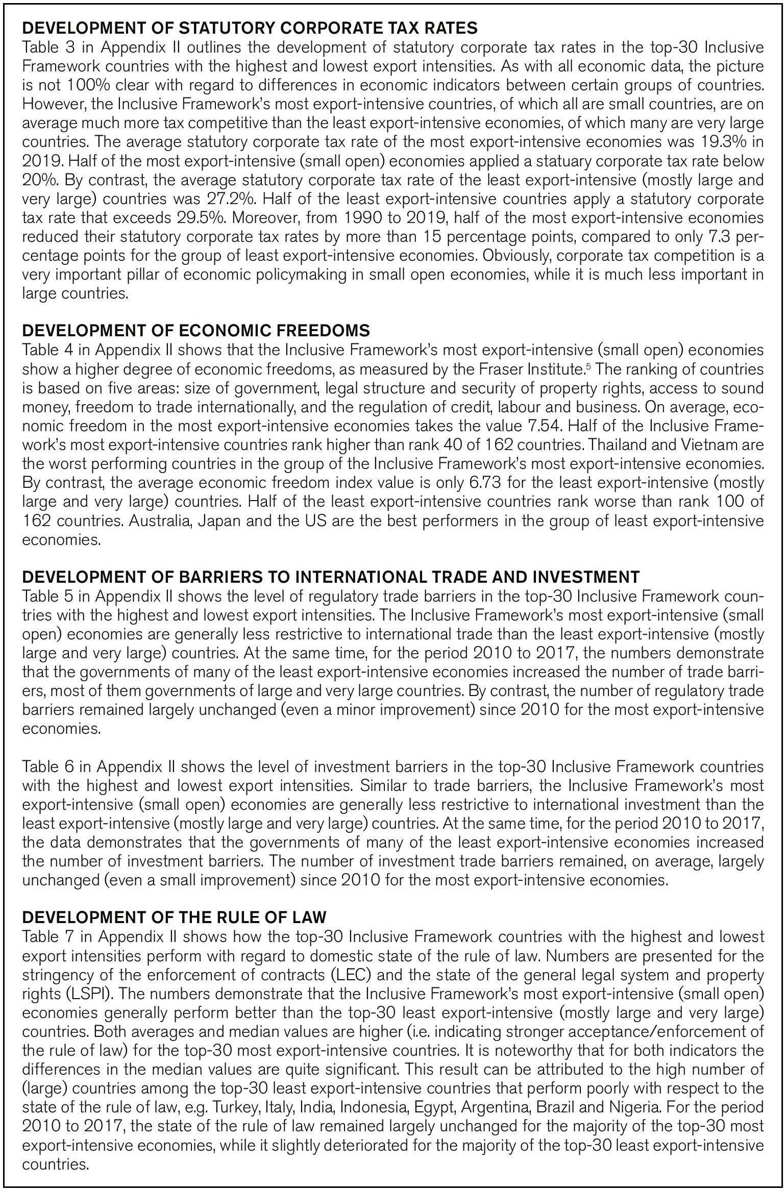 Section 2 will begin with an overview of potential economic impacts outlined by existing impact assessments. Section 3 provides an overview of key economic and institutional features of large countries and small open economies. The analytical focus will be on the Inclusive Framework’s top 30 most and top 30 least export-intensive (or, generally, trade-intensive) economies and how they perform with regard to corporate tax rates, the legal manifestation of economic freedoms, the level of existing trade and investment barriers, and the domestic state of the rule of law. Accounting for the tax sensitivity of international investment and governments’ continuing incentives for tax competition to maintain foreign investment and/or prevent divestment, Section 4 analyses the impact of a narrowing or international corporate tax rate differentials on the reallocation of FDI and FDI-induced tax revenues changes. Section 5 concludes that Pillar I and II are much more impactful than presented by the OECD and national governments.