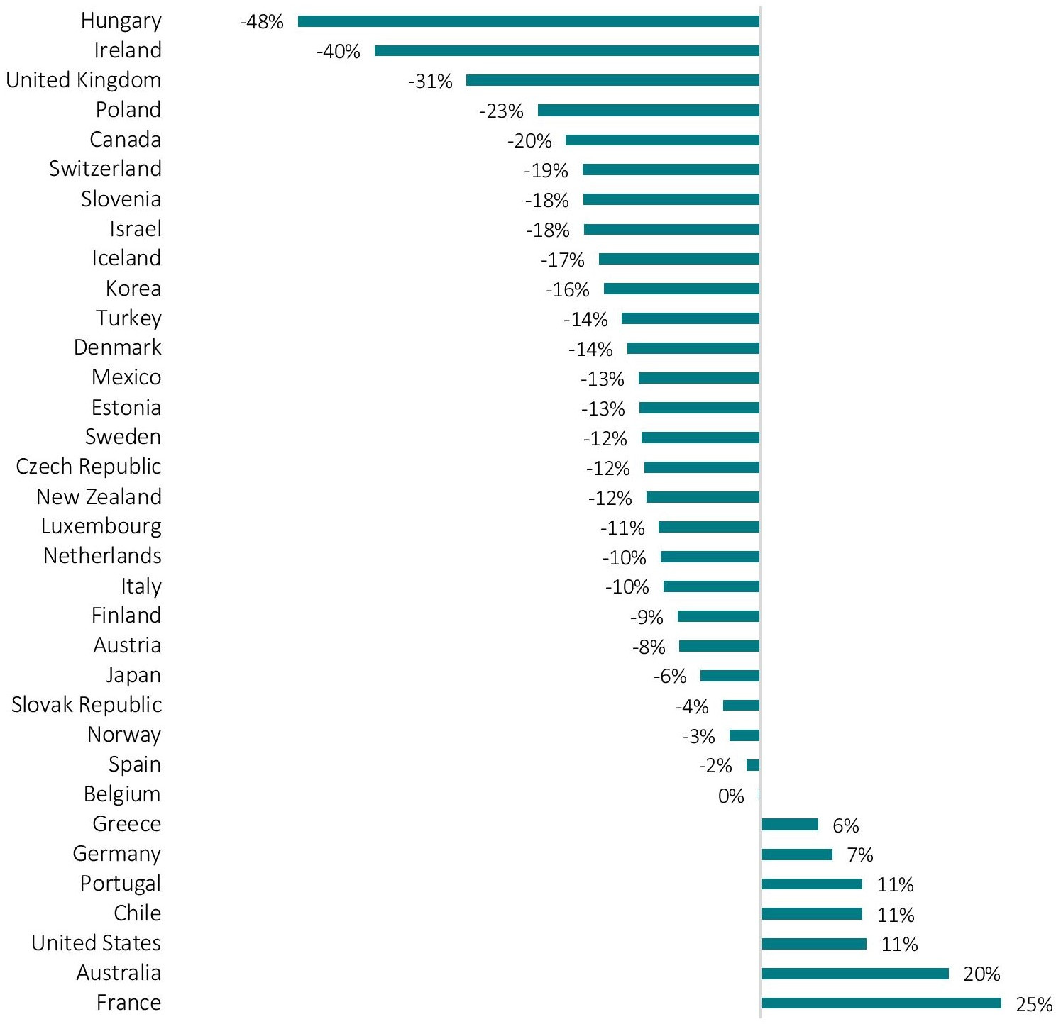A much more significant change in tax revenues may result from the reduction of current effective corporate tax rates to the minimum effective rate proposed by the OECD. If individual governments would lower their effective tax rates to 12.5%, these rates would more or less (depending on specific tax privileges granted for certain sectors or activities) apply for all businesses, including SMEs and micro businesses. It is an often-stated policy objective of the OECD, the European Commission and individual governments to level the tax playing field for businesses of all sizes by eliminating tax loopholes for large multinationals. Assuming a linear relationship between the current levels of countries’ effective corporate tax rates and governments’ tax revenues, we can derive hypothetical annual tax revenues for the 12.5% threshold rate proposed by the OECD. Accordingly, annual corporate tax revenues would decrease significantly for most countries. As outlined by Figure 10, the largest losses in corporate tax revenues would arise in the countries with the highest effective corporate tax rates, i.e. France (-62%), Australia (-60%) and Greece, Portugal (-55%), and the US (-55%). The losses would be lower in relative terms, but still significant in low tax jurisdictions (except for Ireland). For OECD countries, compared to 2018 corporate tax revenues the median percentage loss estimate is -44%.