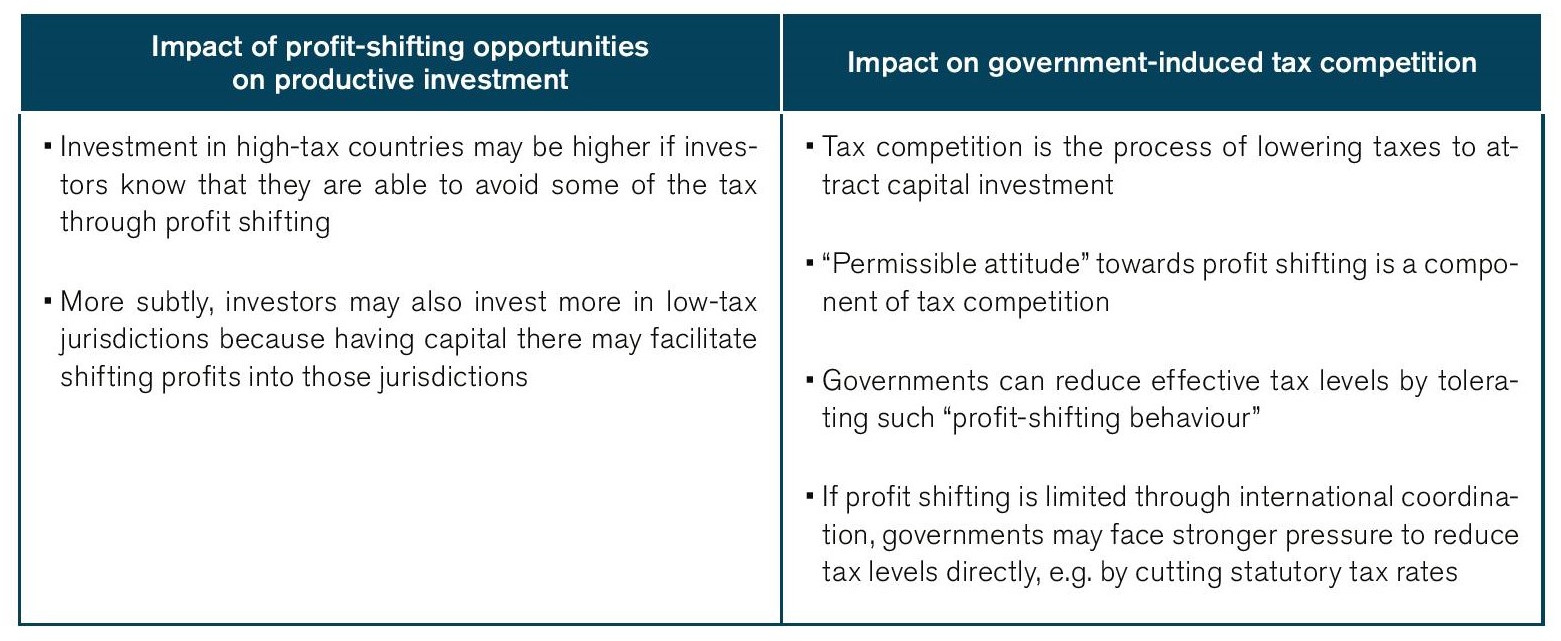 An IMF Working Paper from 2019 (No. 19/287) investigates the impact of internationally operating companies’ profit shifting behaviour on investment activities and the implications of restraints on profit shifting on future tax competition (Klemm and Liu 2019). Following the empirics as well as their own analysis, they conclude that “profit shifting opportunities unambiguously reduce the cost of capital in all countries [analysed].” It is stressed that profit shifting opportunities raise the global stocks of capital. It is concluded that “[g]iven the ambiguity of many of the findings, the recent strength of international [OECD BEPS] efforts at curbing profit shifting may appear surprising.” They also argue that a “permissible attitude” towards profit shifting is a component of tax competition and that governments are unlikely to give up on tax competition in the future.