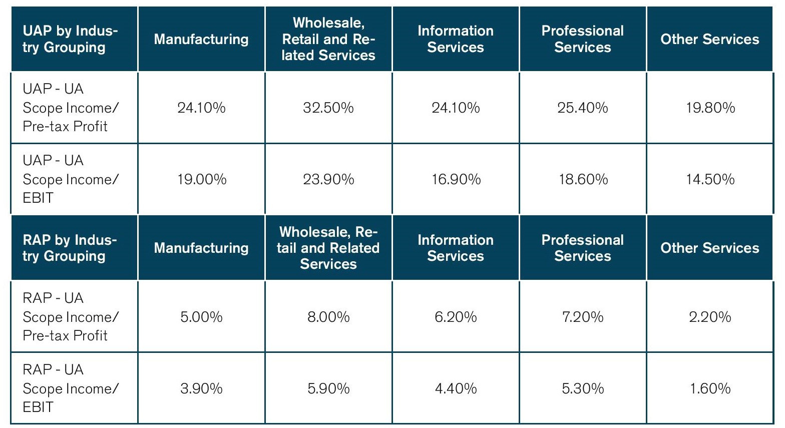 For each sector, the authors provide estimates for the “unified approach scope income” (UAP) expressed as the percentage of a company’s global pre-tax income. The UAP is intended to measure the share of an MNE’s global pre-tax income whose international allocation will be governed by the new formulaic conventions of the unified approach. Based on the authors’ assumptions, the estimates for the UAP range from 15% to 33% depending on the industry and the measure of pre-tax income used (pre-tax profit or earnings before interest and tax, EBIT). The estimates suggest a maximum potential of 67% to 85% in terms of the share of pre-tax income that will continue to be allocated under the arm’s-length principle.