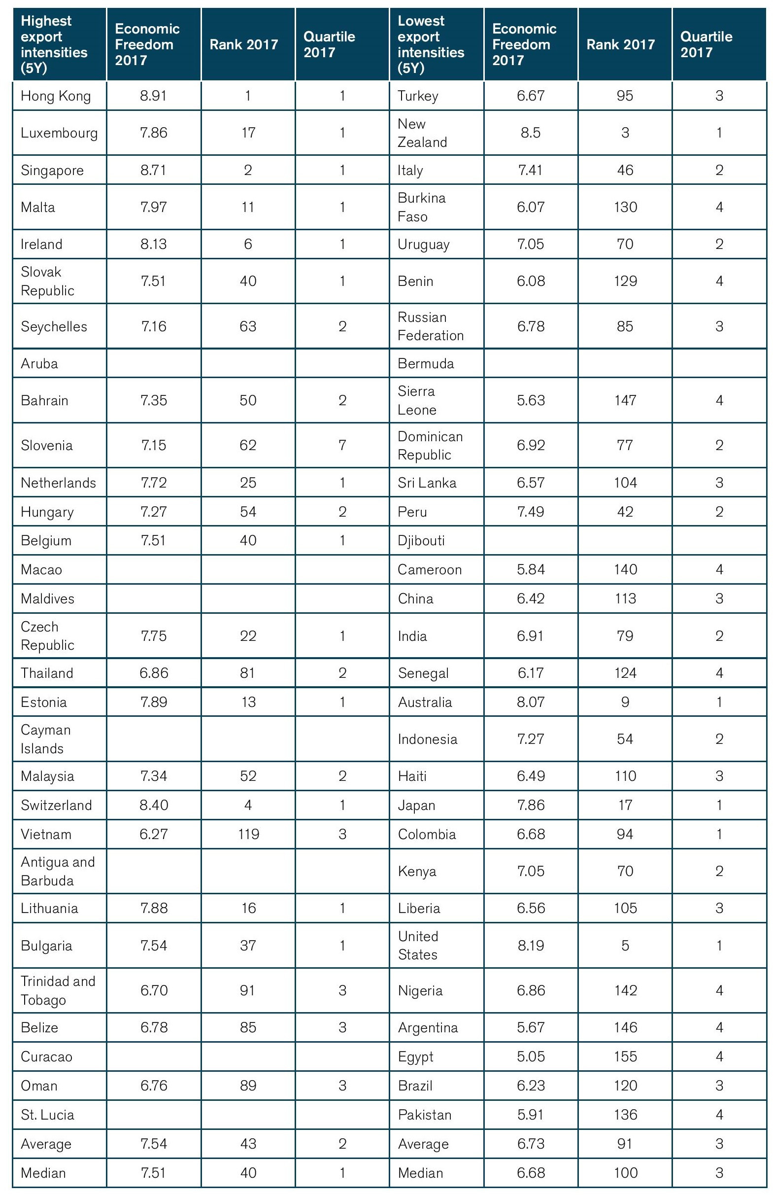 Table 4: Economic Freedom in the Top-30 “Inclusive Framework” countries with the highest and lowest export intensities