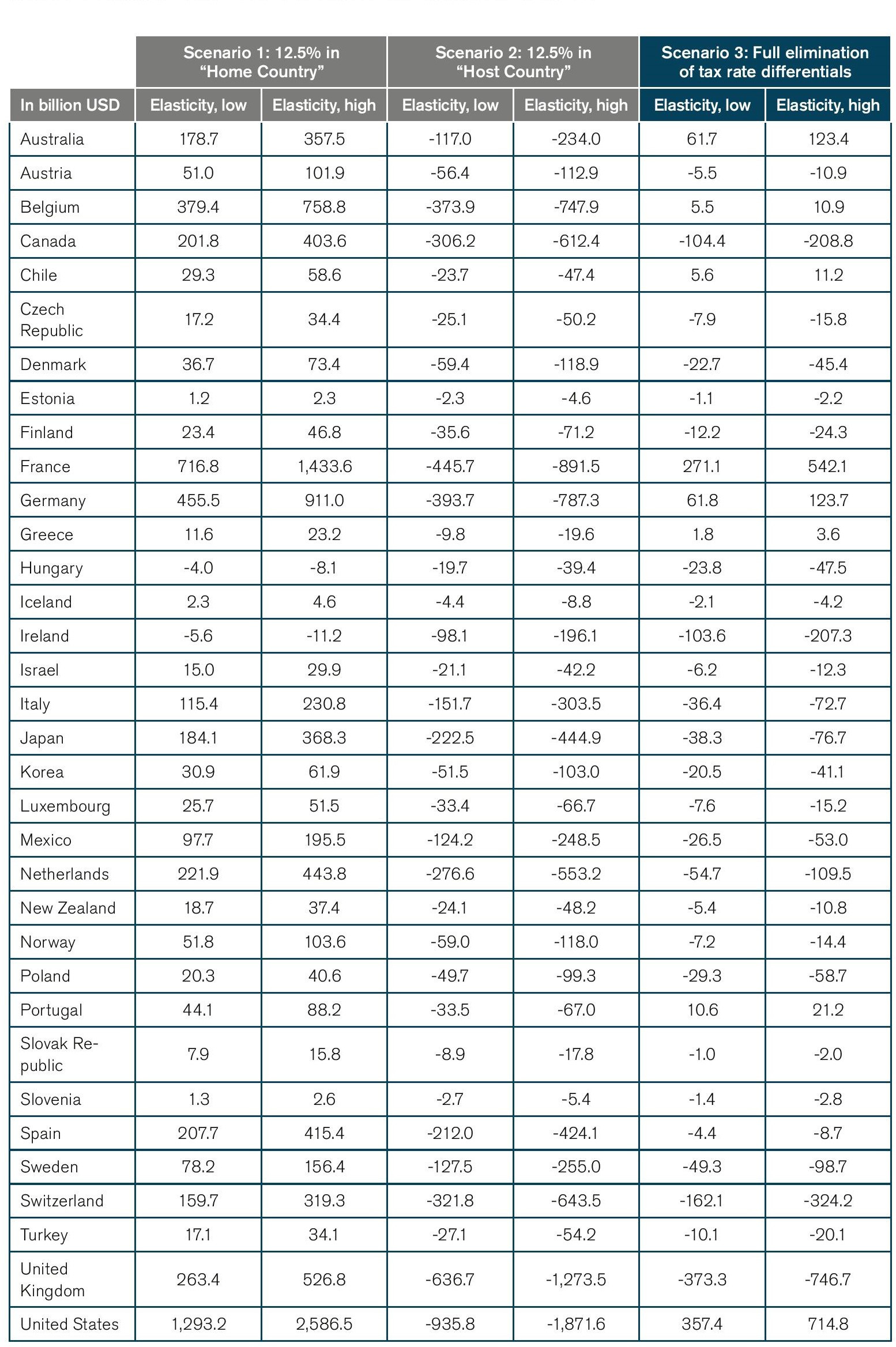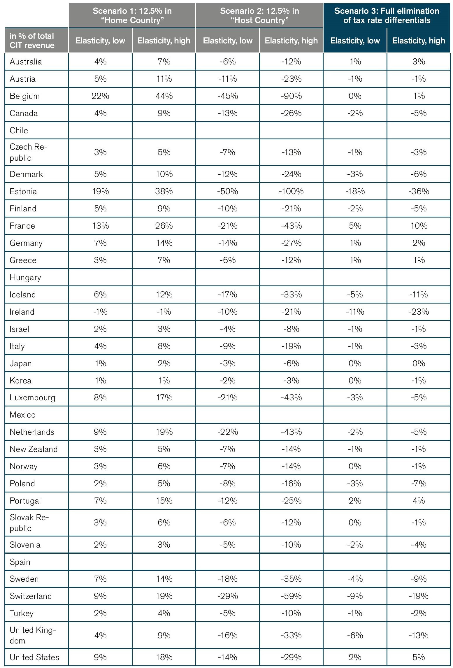 Scenario 3 is considered the most relevant scenario. It outlines the potential end state of a process of sequential tax competition up to the lower bound of 12.5%. Scenario 3 represents the aggregation of effects from scenarios 1 and 2. It can be interpreted as a new equilibrium after a period of gradual and, for some countries, intensified tax competition where neither small nor large countries can compete on effective corporate tax rate differentials anymore. An important implication for small open economies is that in this equilibrium, ceteris paribus, large countries would be more attractive to investors than small countries due to market size and economic gravity effects.
