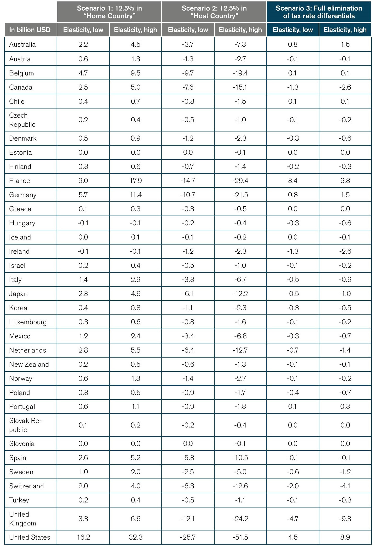 In Scenario 1, we assume that investors’ “home countries” unilaterally reduce their effective corporate tax rate to 12.5%, while the effective corporate tax rates in the partner countries remain unchanged.