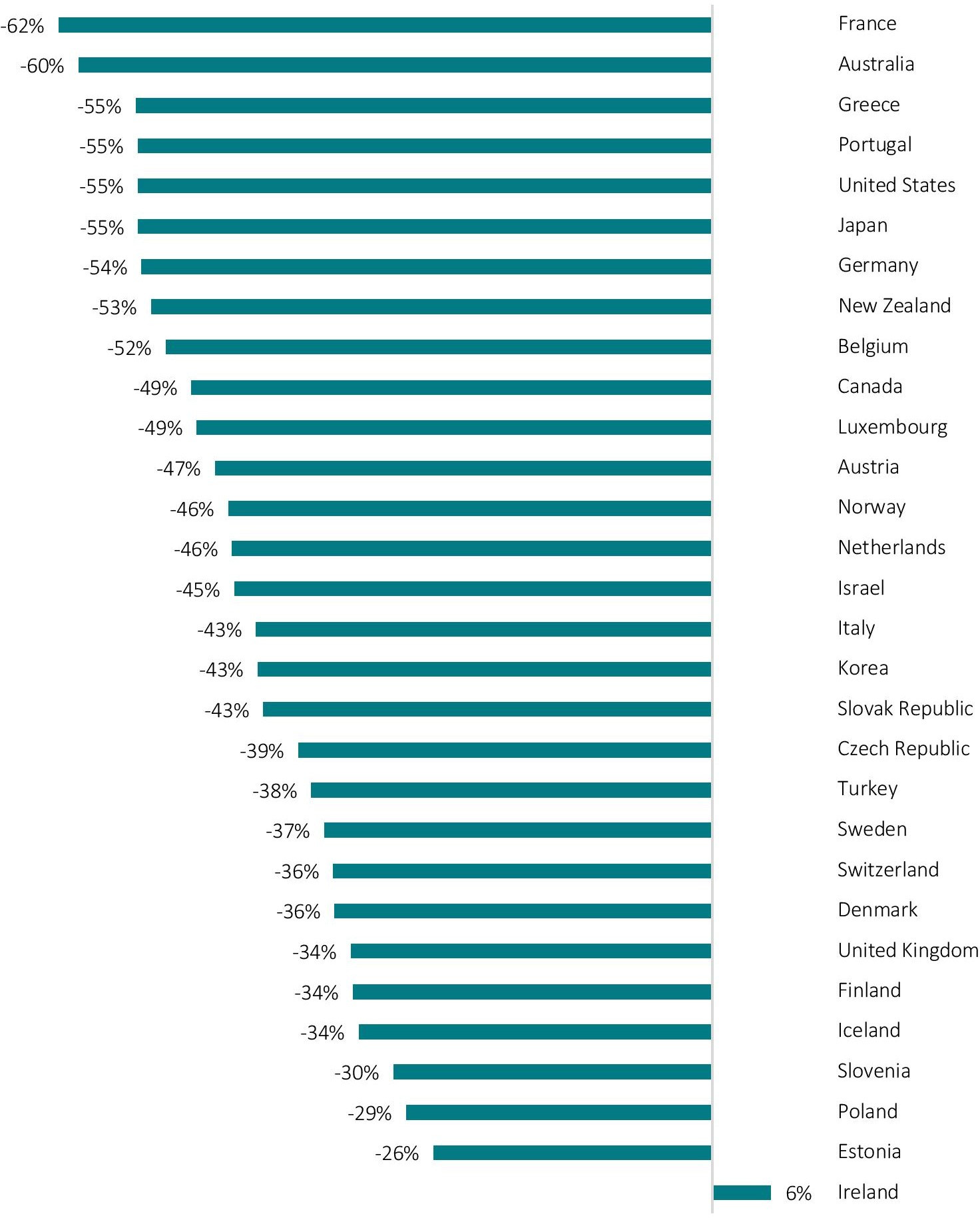 As outlined by Table 8 in Appendix III – Estimation results, for scenario 3 the highest positive net impacts on aggregate domestic investment are estimated for the US (+715bn USD), France (+542bn USD), Germany (+124bn USD), and Australia (123bn USD). The highest negative net impacts in terms of domestic investment are estimated for the UK (-747bn USD), Canada (-209bn USD), Switzerland (-324bn USD), Ireland (-207bn USD), the Netherlands (-110bn USD), Sweden (-99bn USD), Japan (-77bn USD), Italy (-73bn USD), Poland (-59bn USD) and Mexico (-53bn USD).
