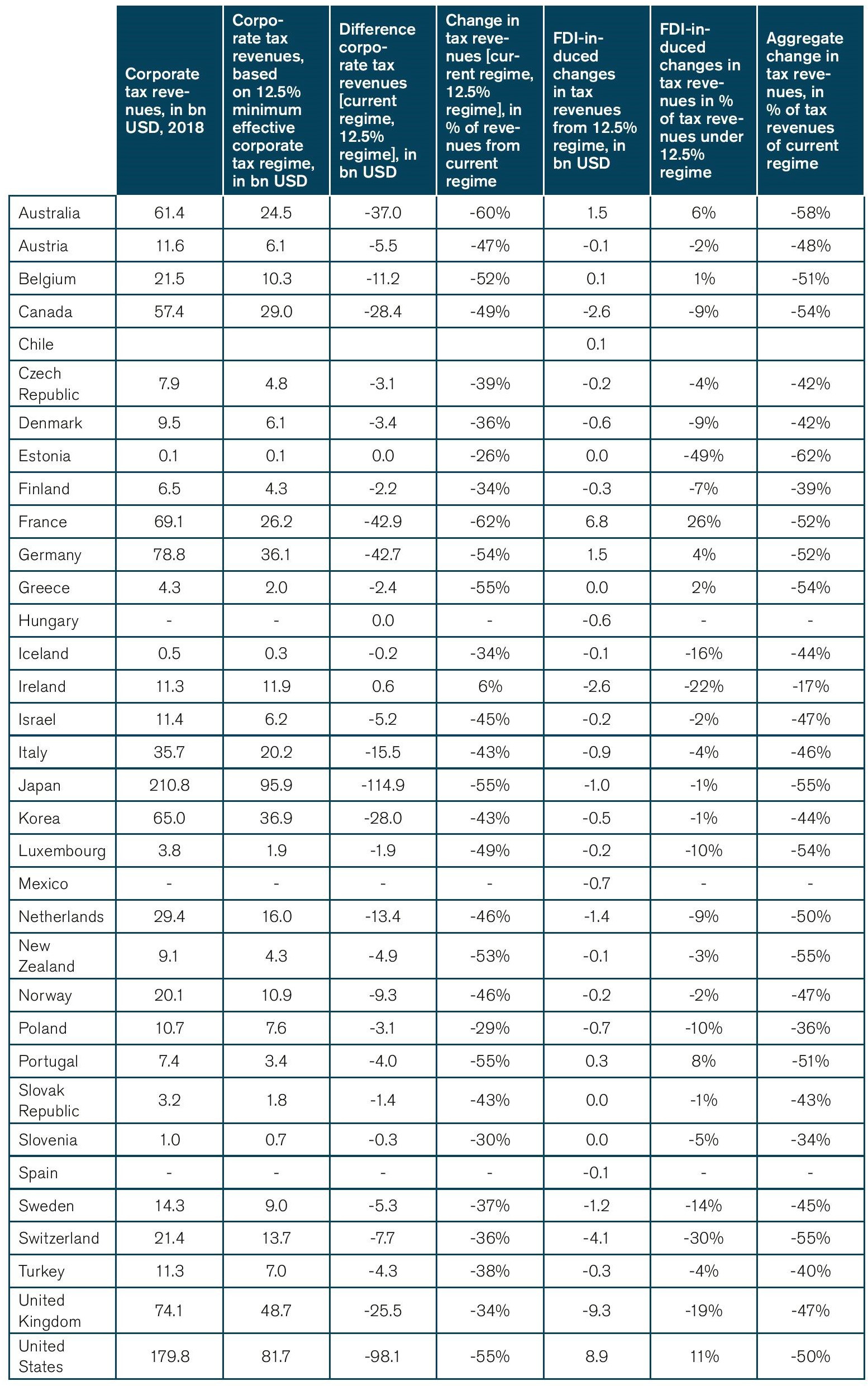 Rising and falling levels of domestic investment would also impact governments’ tax revenues on personal income and revenues from social security contributions. As outlined by Table 11, for most OECD countries, taxes on personal income as well as social security contributions are a much more important source of tax revenue than revenues generated from corporate income. The OECD median multiplier is 1.45, i.e. the sum of revenues from taxes on personal income and social security contributions exceeds corporate income tax revenues by about 45%. Taking into account changes taxes on personal income and social security contributions, the increases in FDI change-induced revenue gains would amount to 20bn USD for the French government, 4bn USD for the German government, and 14bn USD for the US government.[7] Again, it should be noted that these estimates are based on a comparison of tax revenues generated by countries’ current FDI stock and tax revenues generated by countries’ FDI stock in the new equilibrium, everything else remaining equal. The numbers do not reflect the revenue impact resulting from tax revenues generated by other businesses that are subject to corporate income taxes.