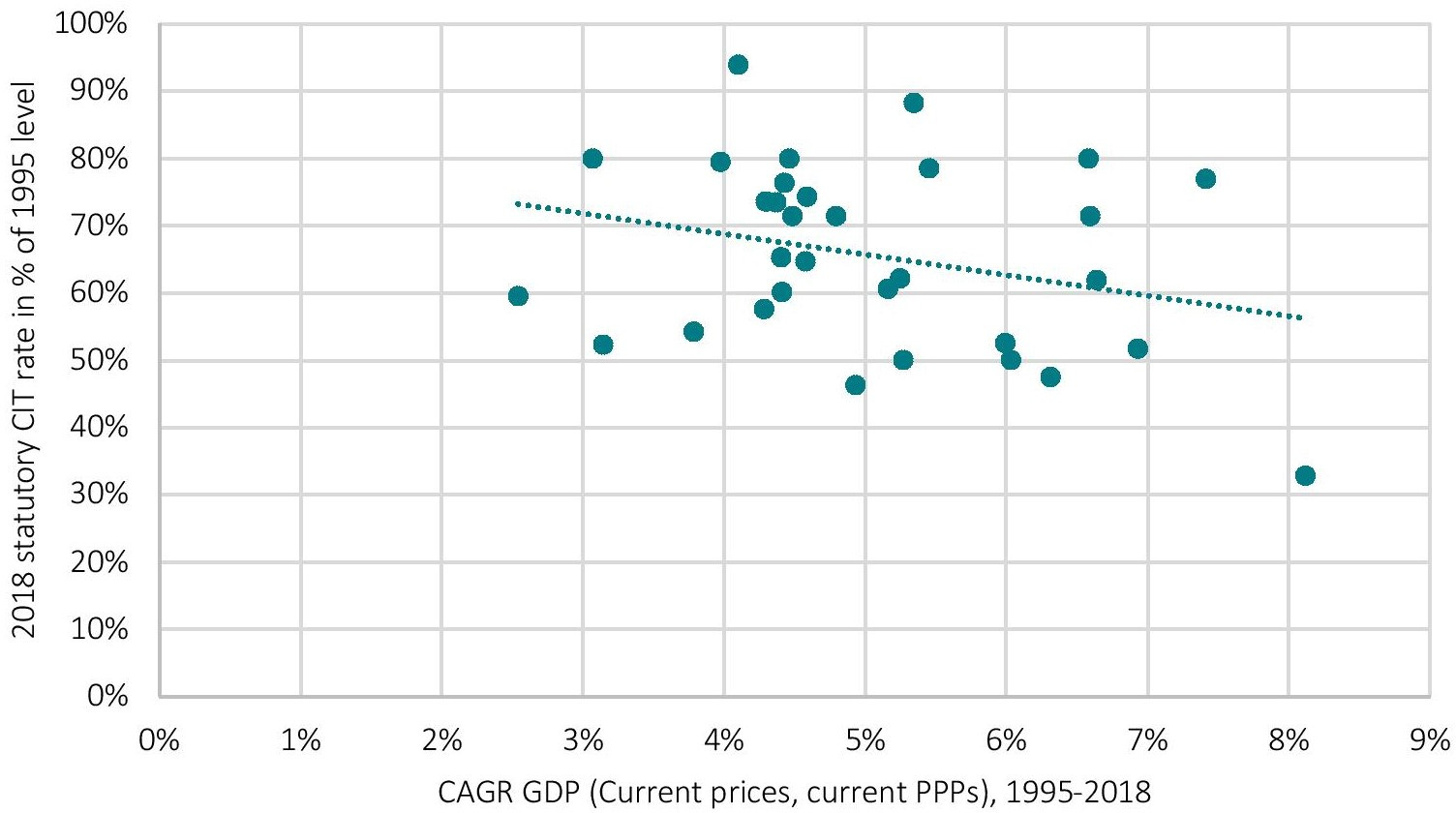 Figure 14: Correlation between reductions in the statutory corporate tax rate and GDP growth