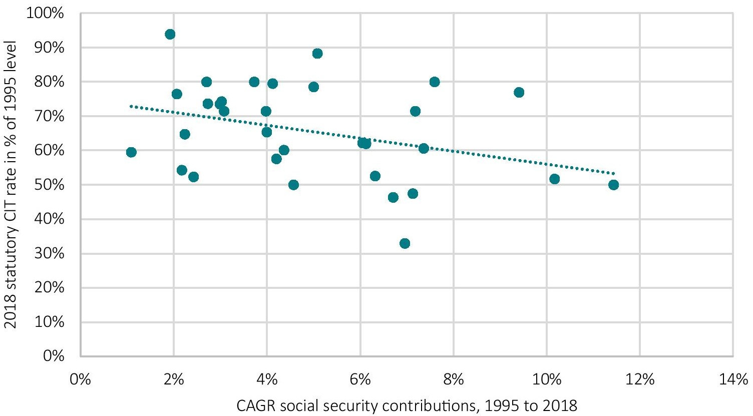 Figure 13: Correlation between reductions in the statutory corporate tax rate and revenues from social security contributions