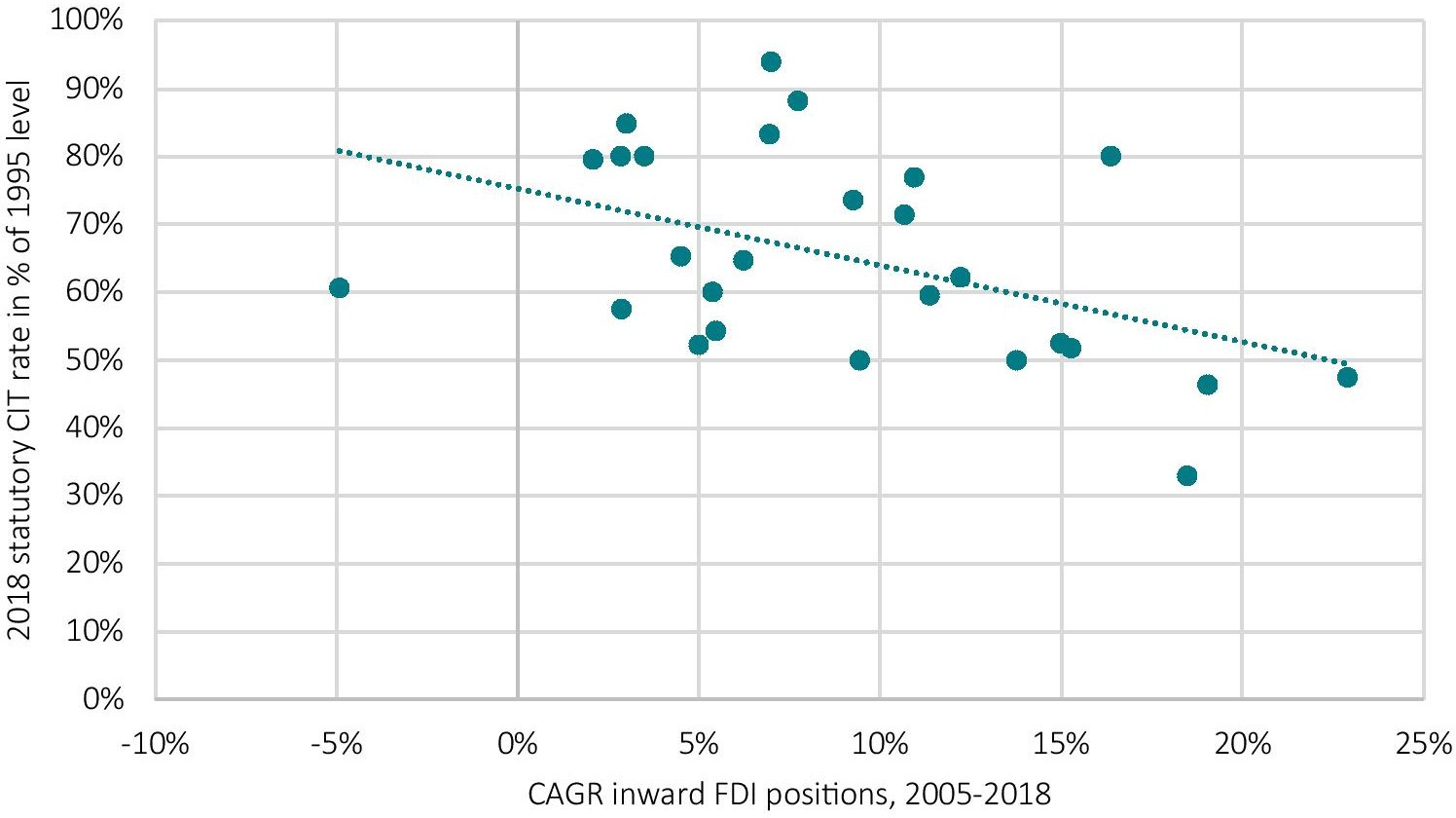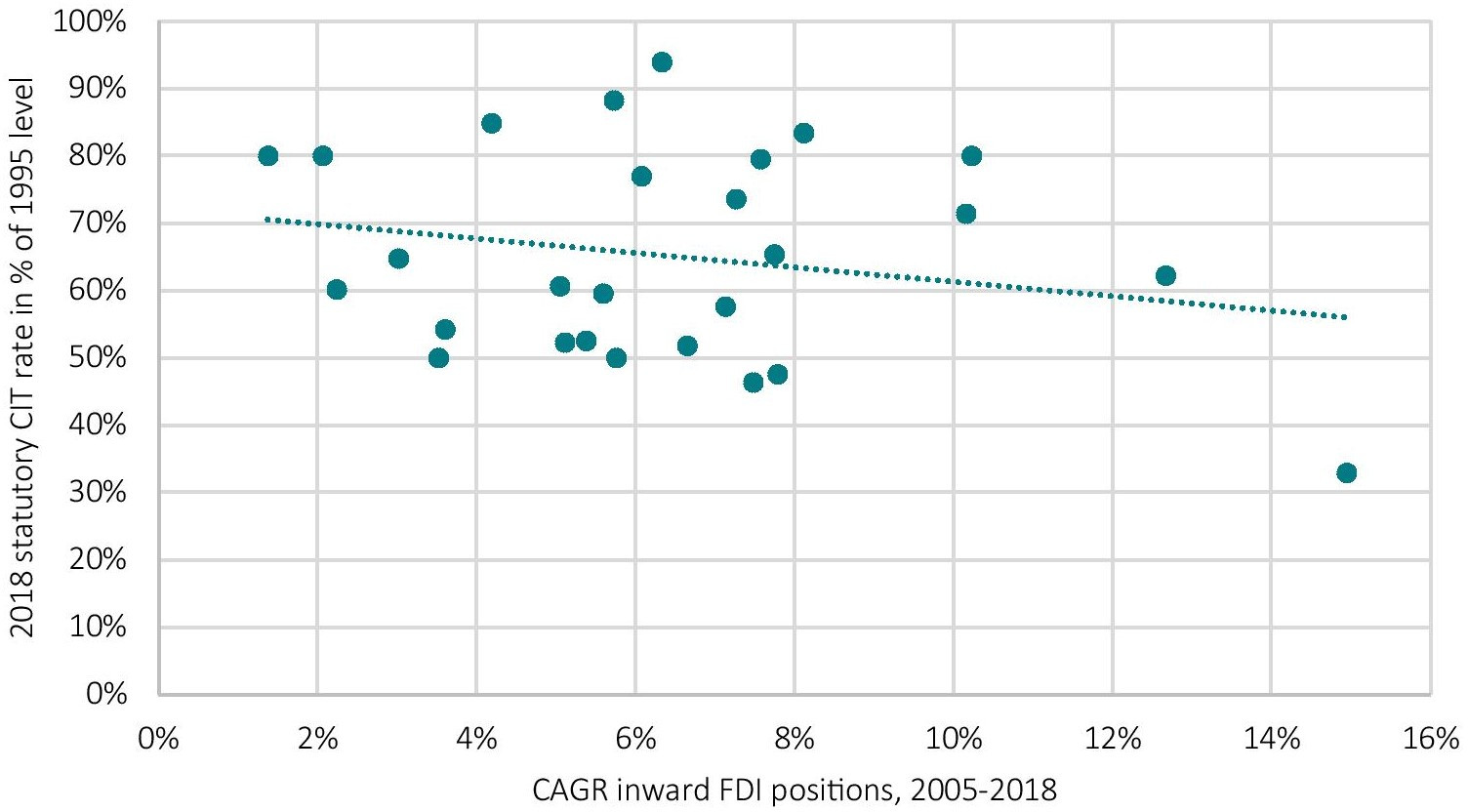 Figure 15: Correlation between reductions in the statutory corporate tax rate and growth in inward FDI positions