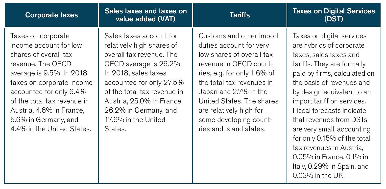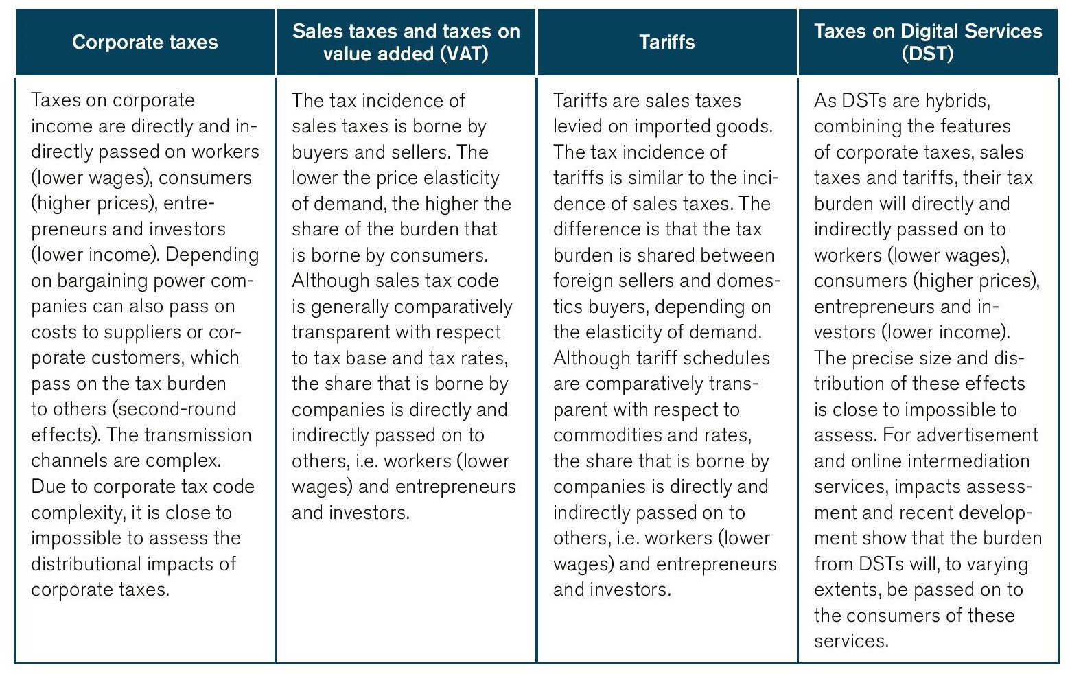 Table 13: Economic costs (tax incidence effects) of corporate taxes, sales taxes, tariffs and taxes on digital services