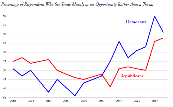 The evidence reviewed below show how both parties are in a state of flux, and that there are contrary currents in both of them. The most obvious conflict is in the Republican Party, where Trump’s efforts to revive protectionism have gone unchallenged. That may change as the 2020 campaign draws nearer, especially if — as expected — one or more of Trump’s critics contest the party’s presidential nomination. Perhaps the most intriguing development concerns the rising level of pro-trade sentiment in the base of the Democratic Party. Those views have yet to percolate up to the party’s congressional hierarchy, and they also collide with the increasingly trade-skeptical views in such established Democratic constituencies as unions and consumer organizations. It is nevertheless possible that the time is coming for a new Democratic leader to take a page from Trump, in form if not in substance, and go against the party’s orthodoxy in a campaign for the presidential nomination.